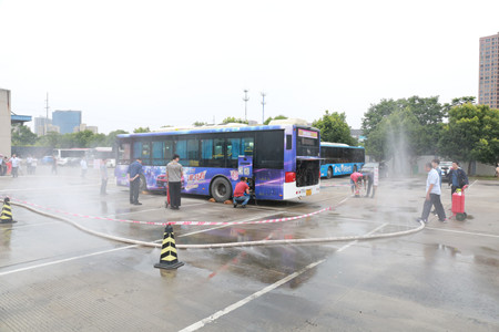 6月22日,公交公司开展天然气公交车辆泄漏突发事件应急处置演练。当天上午10:00整,演练总指挥陈备鸣宣布演练开始。演练现场模拟一辆新能源天然气公交车在公交场站内等待发车,驾驶员在发车前检查中发现LNG燃气压力表下降异常后,立即断开车辆电源,跑至修理车间请来专业维修人员检查车辆。经维修作业人员诊断,该公交车发生了天然气严重泄漏故障。公交公司及时启动应急预案,有序疏散附近群众,在车辆周围设置警戒区域,展开水幕,放置警示牌、三角木,做好消防应急准备等措施。经过各部件系统化的检查和维修后,故障车辆维修完毕并再次通过复检,确认故障排除。直至车辆驶离维修区域,清理维修警戒区,恢复现场正常秩序,现场演练正式结束。