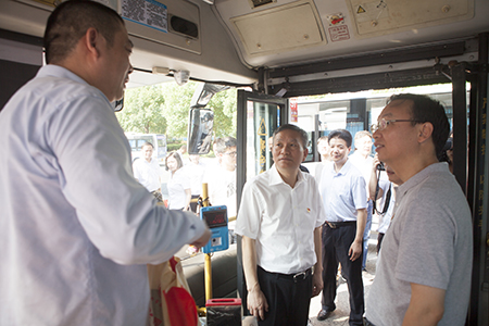 毛宏芳一行走上公交车,与一线驾驶员亲切交谈,感谢公交驾驶员的辛苦付出,嘱咐广大公交驾驶员要注意身体,做好防暑降温,开好安全车。随后毛宏芳询问了公交营运情况,要求公交公司做好防暑降温工作,保障市民公交安全出行。